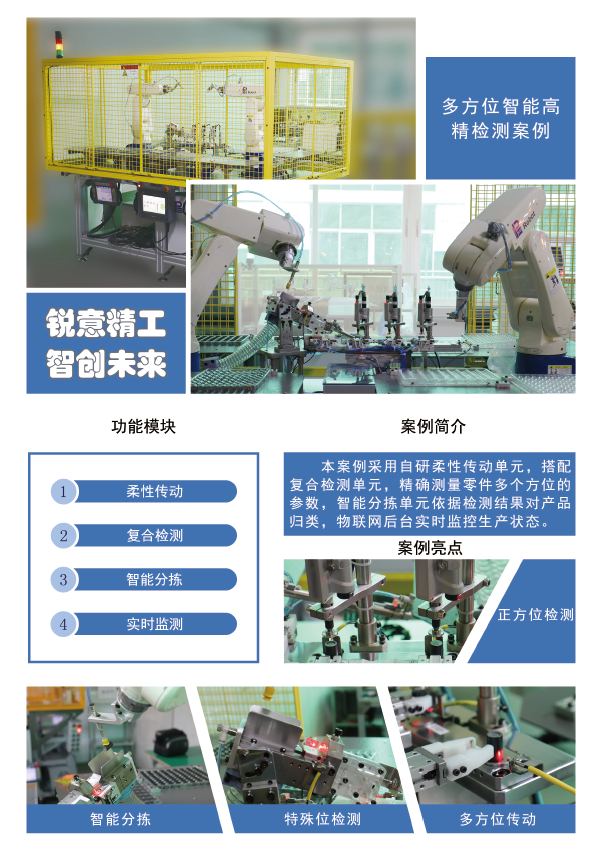 采用自研柔性传动单元,搭配复合检测单元,精确测量零件多个方位的参数,智能分拣单元依据检测结果对产品归类,物联网后台实时监控生产状态。