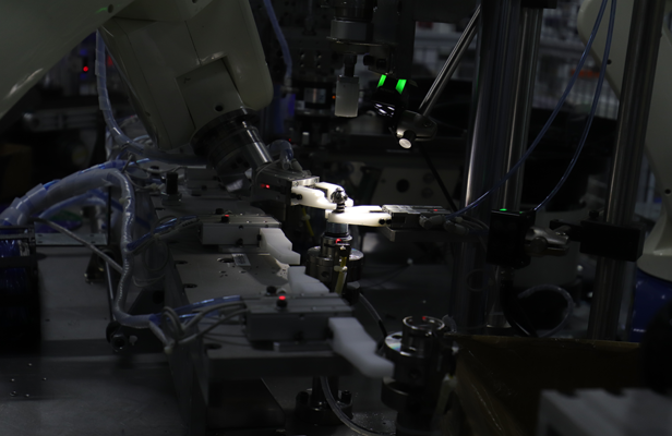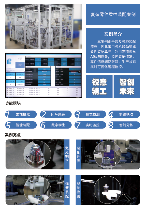 采用多机联动组成柔性装配单元,解决多种装配流程,利用高精视觉AI检测设备,监控装配情况,零件信息闭环跟踪,生产状态实时可视化远程监控。